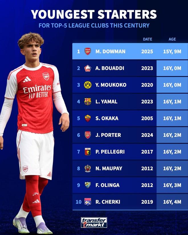 德转列本世纪五大联赛俱乐部最年轻的首发球员榜单,阿森纳的道曼以15岁零9个月排名榜首。